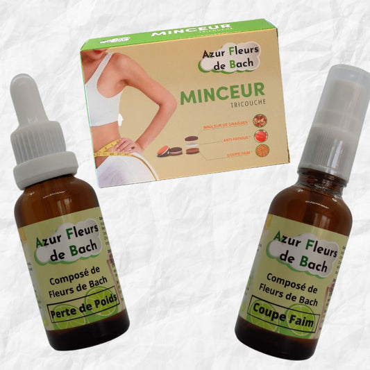 Pour une approche globale, nous vous proposons d'associer nos Fleurs de Bach aux vertus de la phytothérapie avec les comprimés Minceur Tricouche. Sa formulation naturelle permet de garder le moral, brûler les graisses et réduire la sensation de satiété. Elle booste aussi les immunités pour réduire la fatigue, pour que vous puissiez vous concentrer sur votre épanouissement personnel. Pour fixer vos objectifs, les séances d'hypnose minceur permettent de vous détendre et de vous relaxer. Chaque séance, à télécharger puis à écouter à la fréquence de son choix, permet de renforcer sa détermination, mais aussi s'orienter plus facilement vers des aliments sains, bons pour la santé, en évitant les séances de grignotage. L'image de soi occupe également une place de choix, avec un processus d'acceptation de son apparence pour se sentir mieux dans son corps. Les émotions négatives disparaissent de même que les pulsions alimentaires. La perte de poids est durable, favorisant un corps en bonne santé.