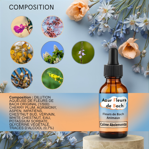 Solution aqueuse de 7 fleurs de Bach (dilution 1/500) Aspen Populus tremula, Agrimony Agrimonia eupatoria, Chestnut Bud Aesculus hippocastanum, Cherry Plum Prunus cerasifera, Impatiens Impatiens glandulifera , Vervain Verbena officinalis , White Chestnut Aesculus hippocastanum, et au de source, sorbate de potassium, glycérine végétale, traces d’alcool (0,7%) – uniquement issues du procédé de macération des fleurs – aucun ajout d’alcool lors de la fabrication.