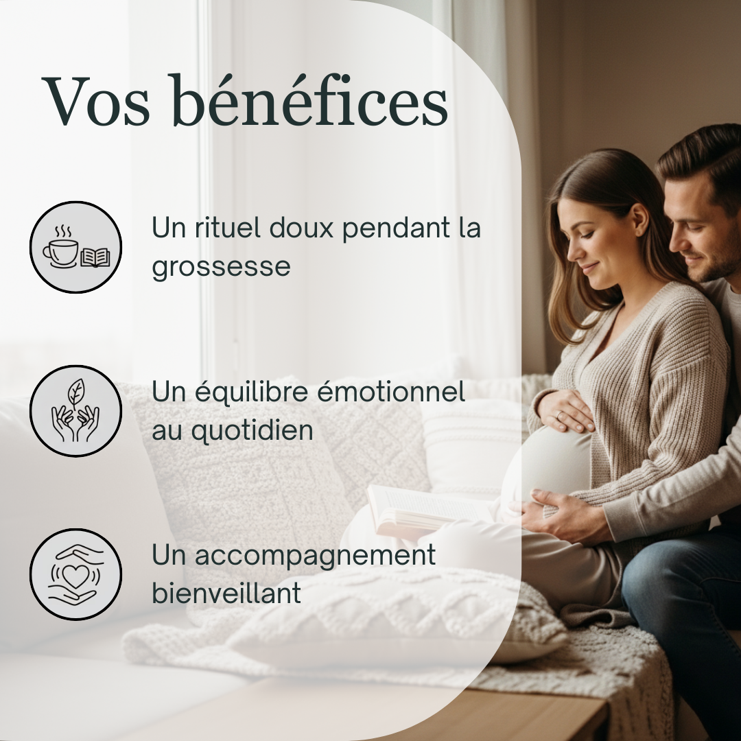 La grossesse est souvent une période intense : joie, impatience, doutes, sensibilité, besoin de se rassurer… Beaucoup de femmes remarquent que l’émotionnel peut prendre plus de place au quotidien, surtout quand tout change en même temps. Cette préparation a été pensée pour accompagner cet équilibre intérieur et aider à traverser l’étape avec plus de douceur.