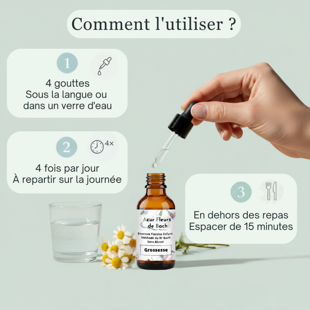 Un flacon de 30 ml ≈ 4 semaines d’utilisation. L’accompagnement émotionnel s’inscrit dans la durée ; poursuivre au moins 2 mois selon votre ressenti.