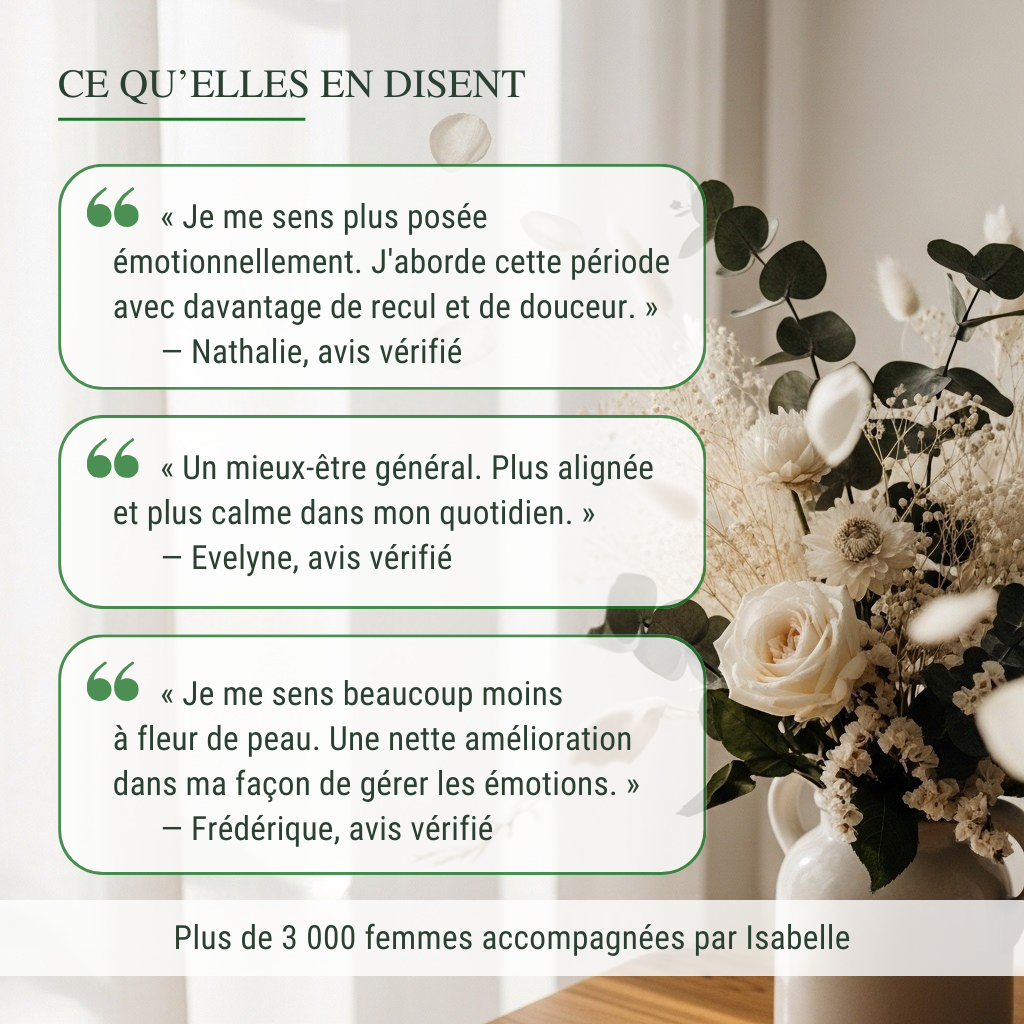 Avis vérifiés de clientes accompagnées par Isabelle dans sa démarche de mieux-être ménopause.