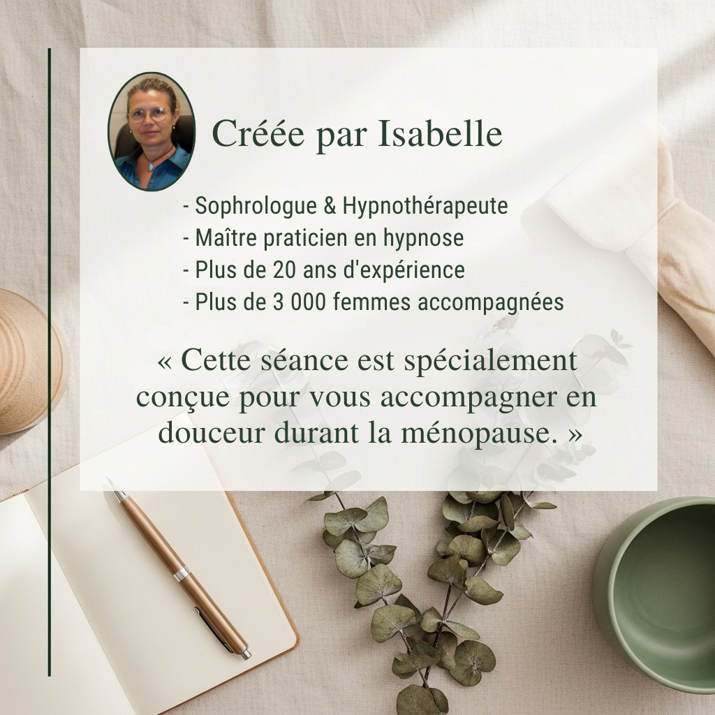 Cette séance d'hypnose guidée a été créée par Isabelle — sophrologue et hypnothérapeute depuis plus de 20 ans — spécialement pour accompagner les femmes en période de ménopause.
