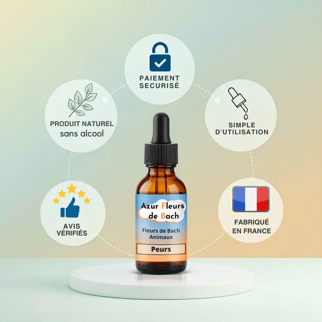 Les Fleurs de Bach sont des extraits floraux naturels qui peuvent aider à apaiser les émotions de votre animal sans effets secondaires nocifs. Notre mélange est spécialement conçu pour les animaux peureux et anxieux , et il est fabriqué en France selon la méthode originale du Dr Bach pour garantir une qualité optimale.