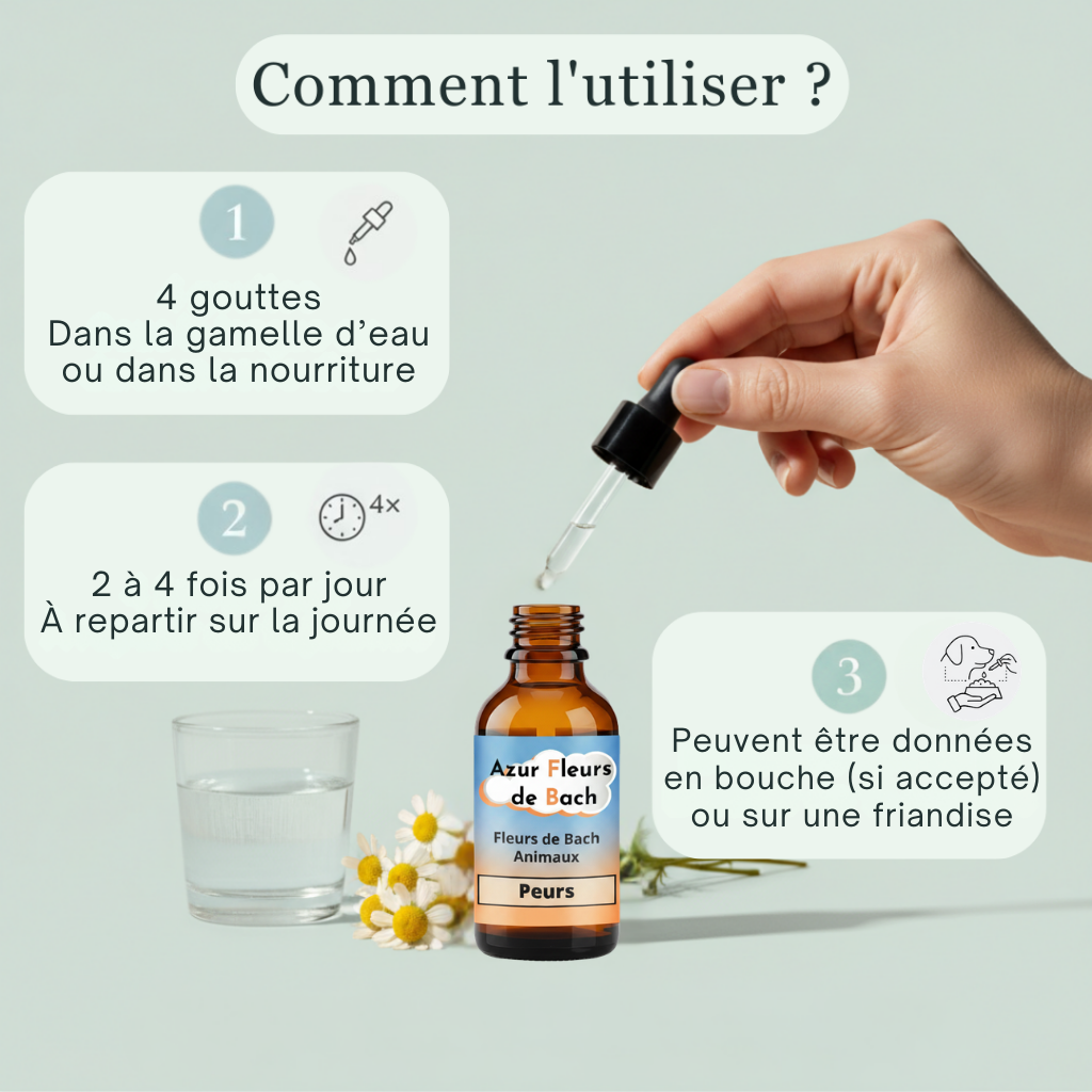 Les Fleurs de Bach peuvent être la réponse à ses inquiétudes . Notre mélange spécial de 6 Fleurs de Bach soigneusement sélectionnées est conçu pour aider les animaux peureux à retrouver leur calme intérieur.
